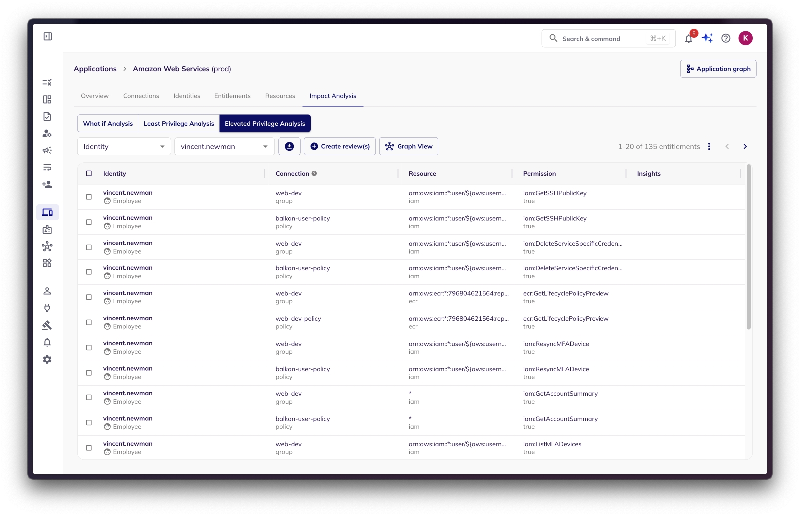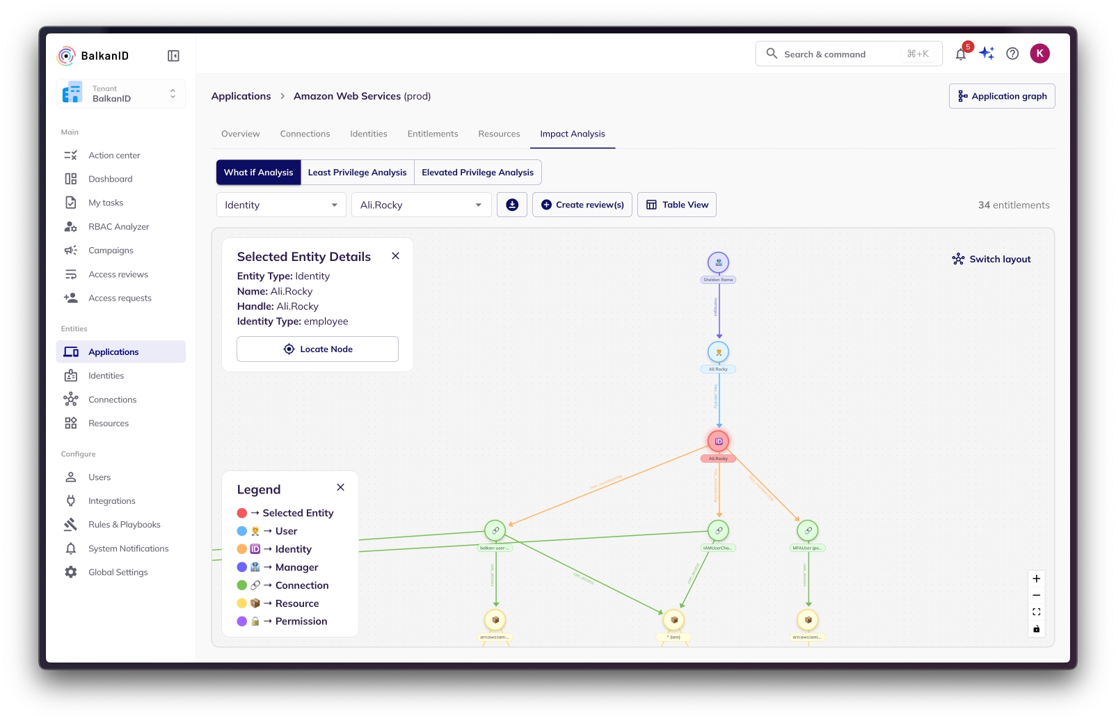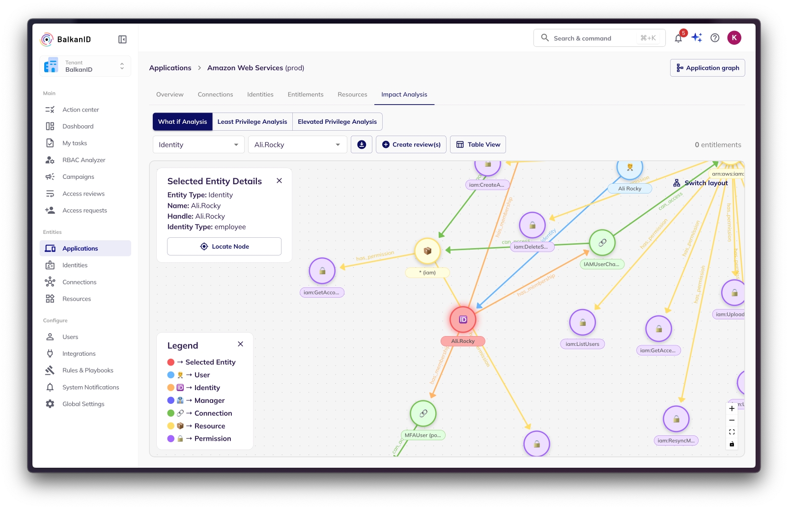The What-If Analysis empowers you to simulate the removal or deletion of an entity (identity, resource, connection, or permission) and visualize its cascading impact on other entities within your environment.