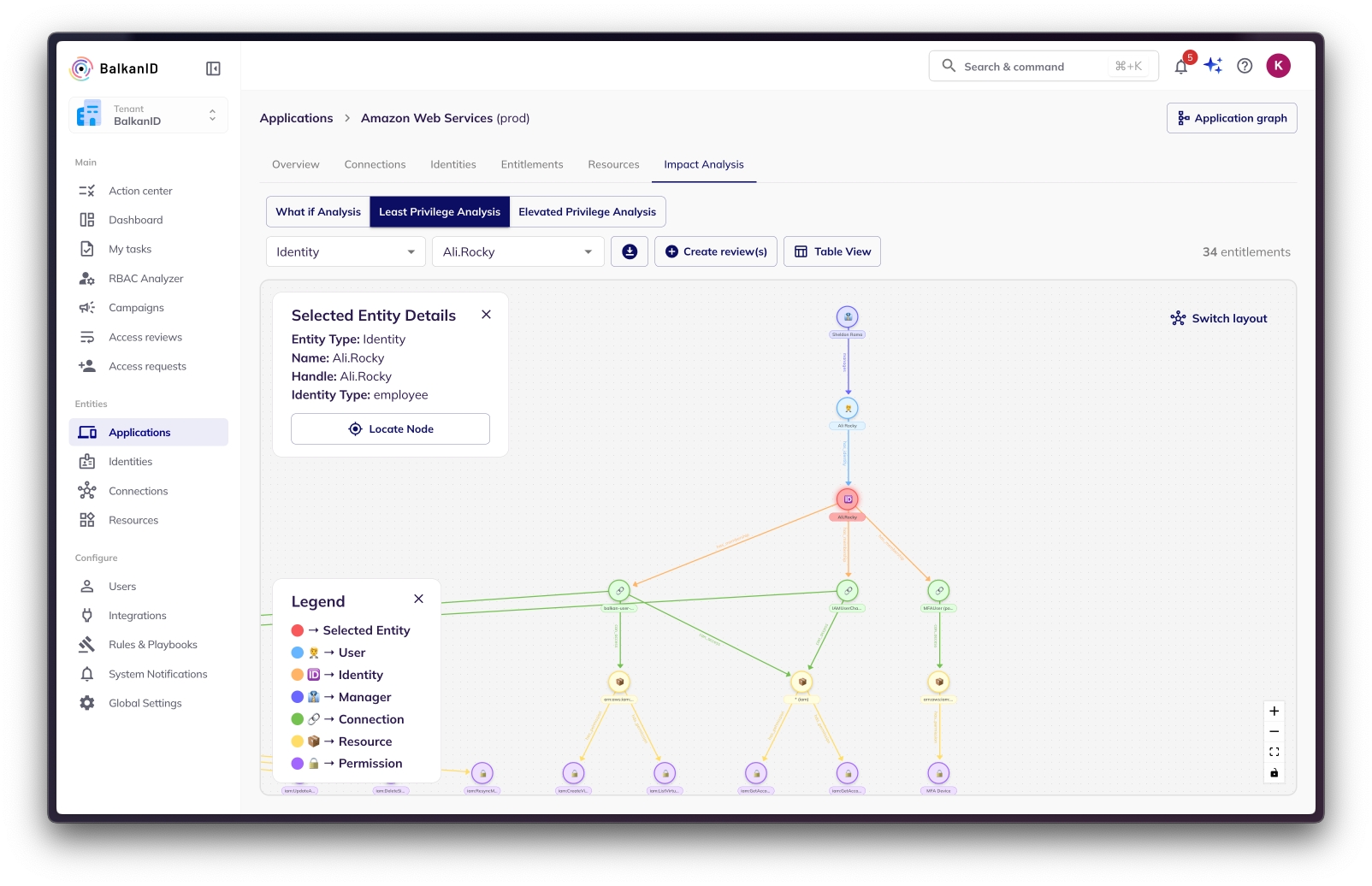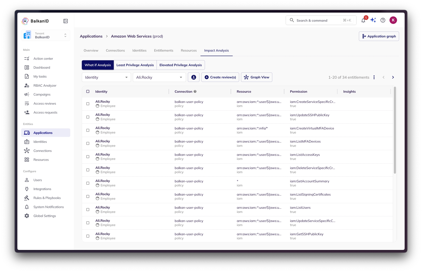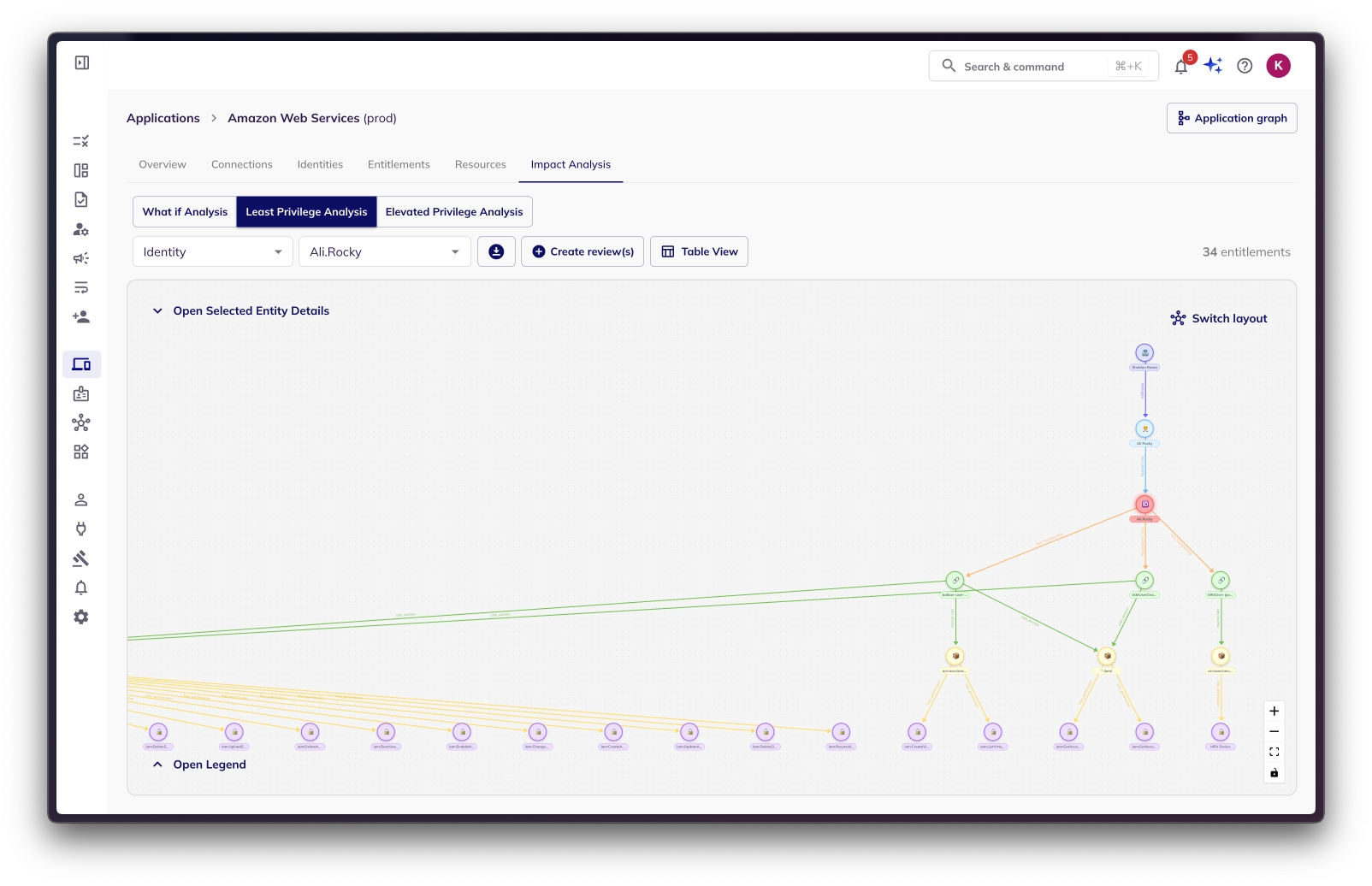 The What-If Analysis empowers you to simulate the removal or deletion of an entity (identity, resource, connection, or permission) and visualize its cascading impact on other entities within your environment.
