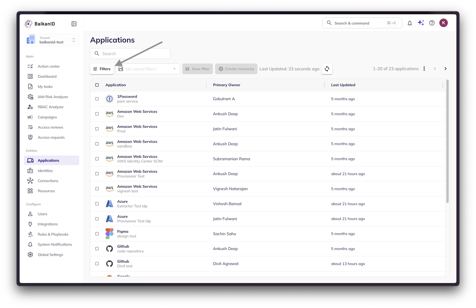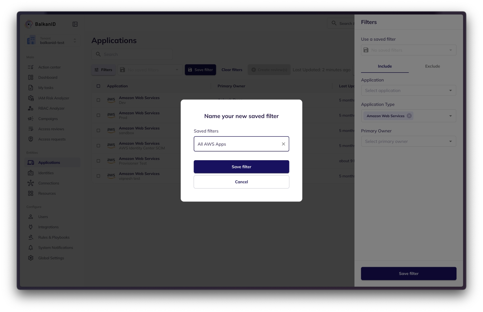 Filters allow users to drill down and find the specific identities and entitlements they are looking for. From there, they can perform various operations like downloading the data as a .PDF or .CSV file and creating an access review based on these filters.