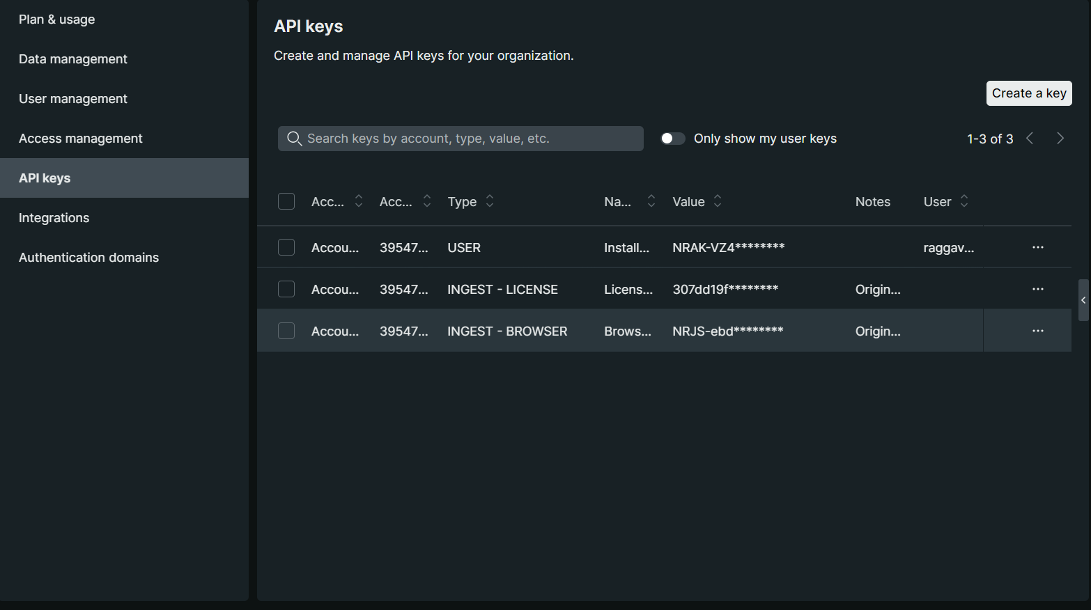 Login to your New Relic account. The User API key needs to be generated from a user who is a part of the admin group (has admin permissions).