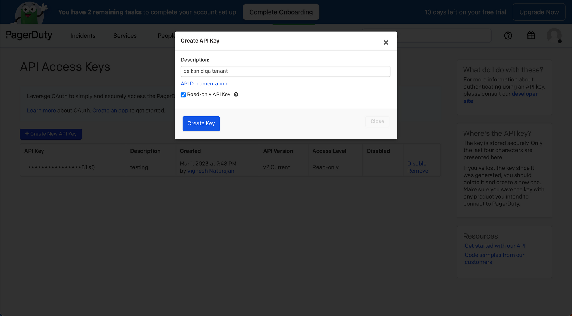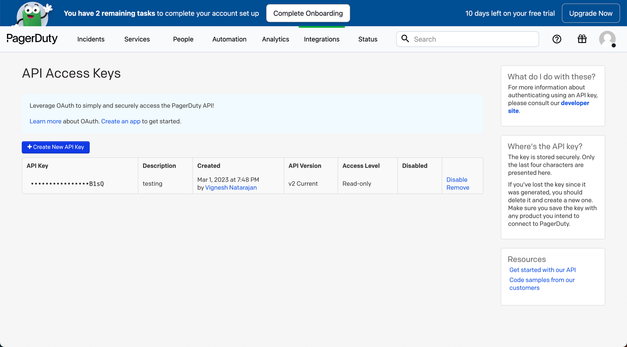 2. On the navigation bar, go to **Integrations > Developer Tools > API Access Keys** and click on it, you should see a page like this:<br>