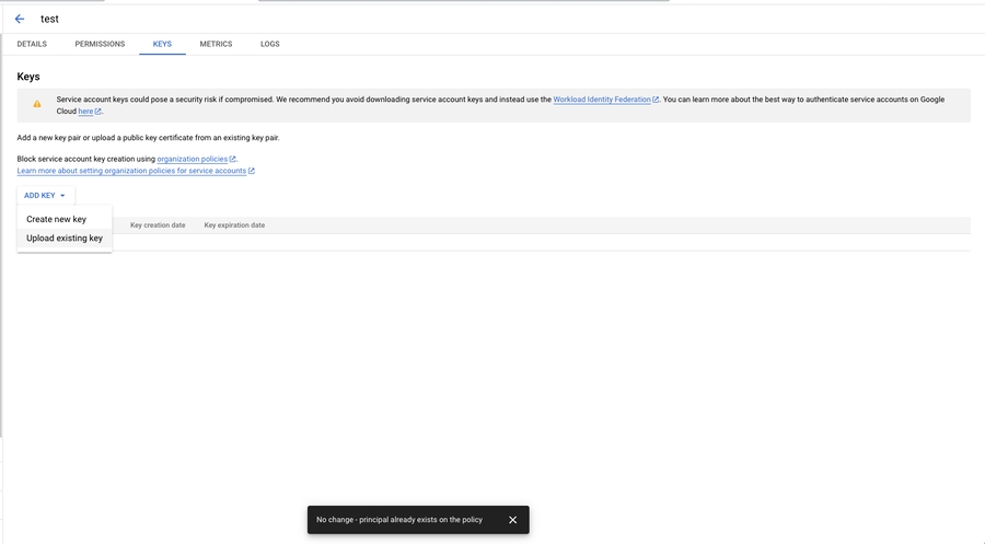 After this, click on the service account email you just created. Go to the Keys section, click on Add Key > Upload Existing Key and upload the provided public key.
