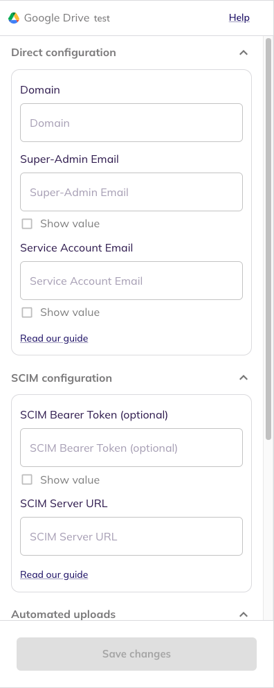 Google Drive would have been added to the list of applications. Click on the Configure and Integrate button beside the integration name, and configure the fields with the values that were noted prior. It should look like this: