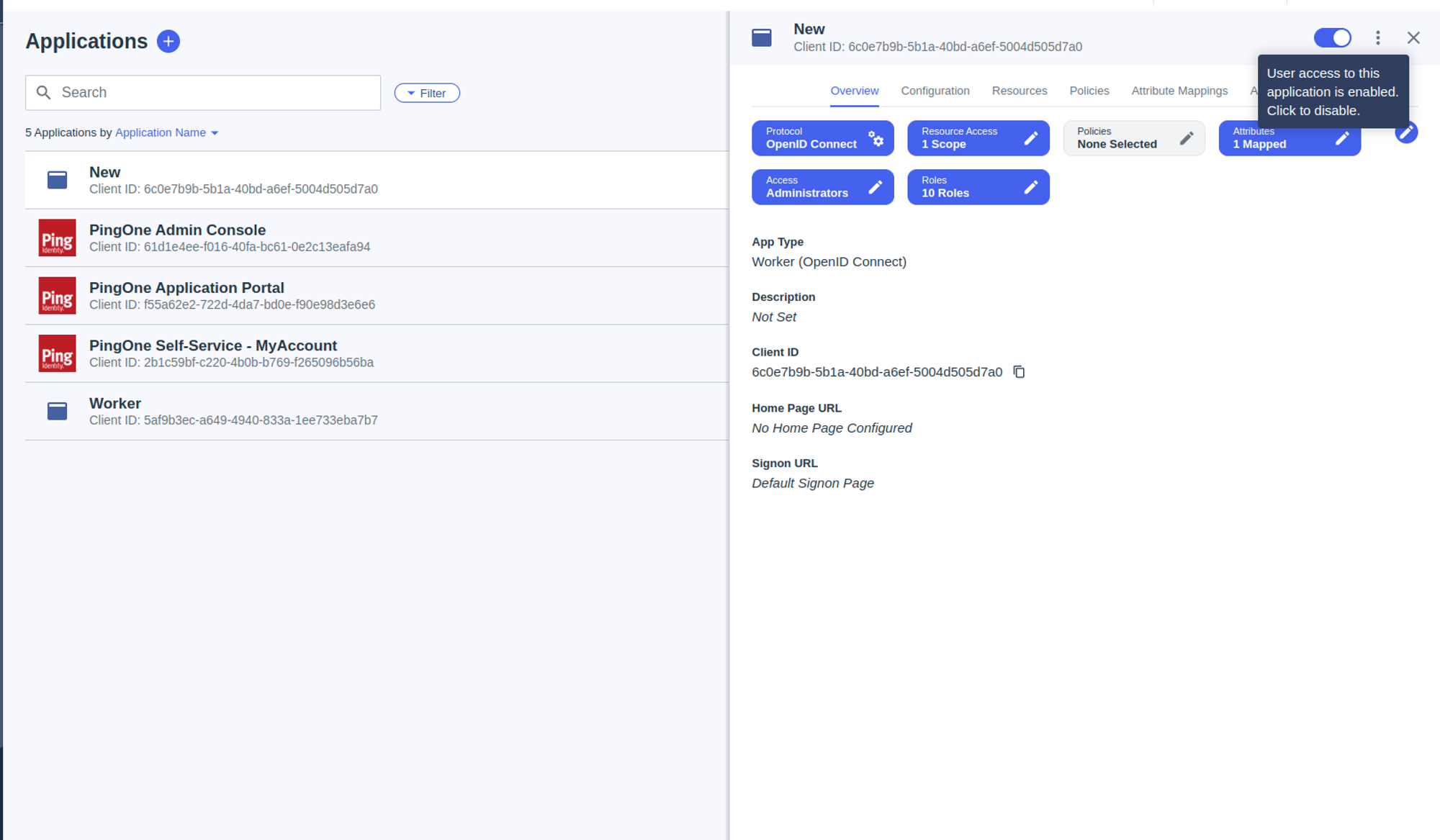 On the application's Overview page, click the toggle at the upper right to enable the application.