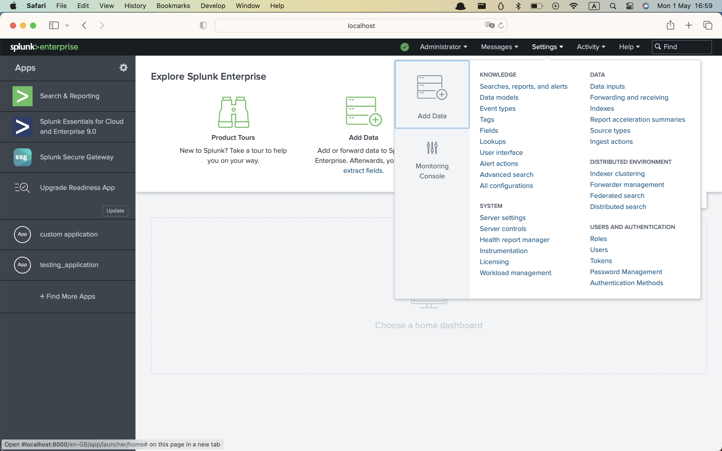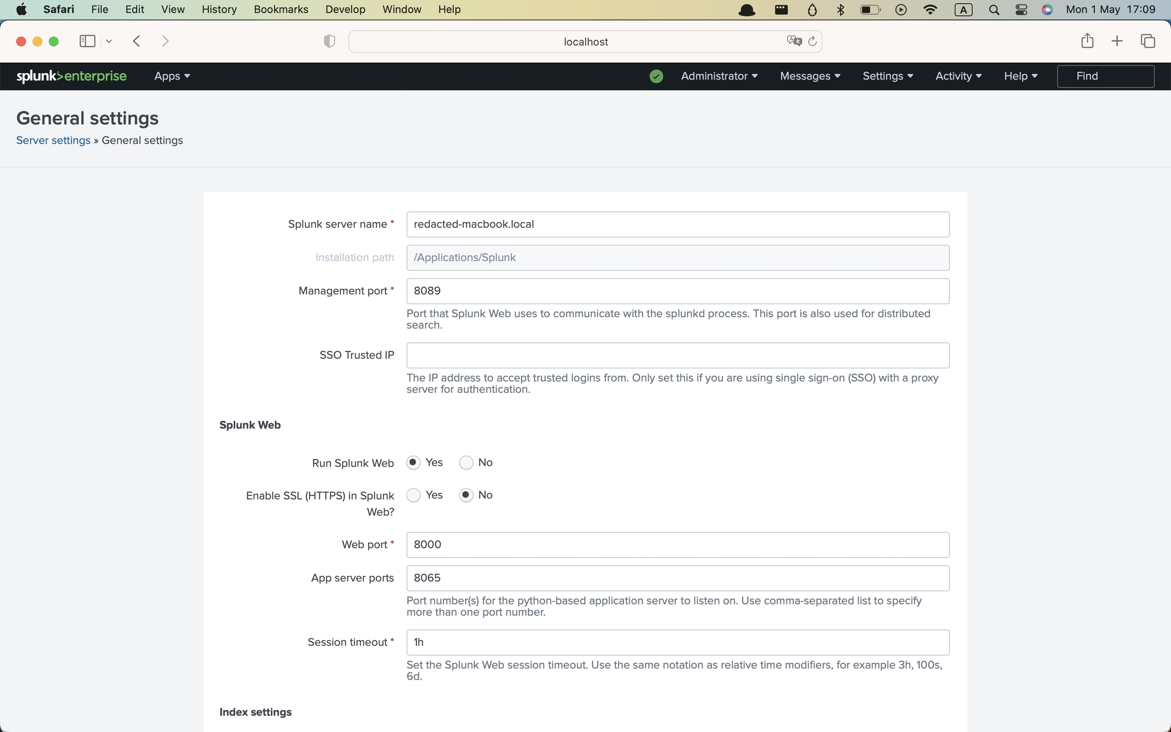 Find your Splunk Enterprise deployment’s REST API base URL. Go to Settings > General Settings. Note down the value of the management port. Your API will be located at