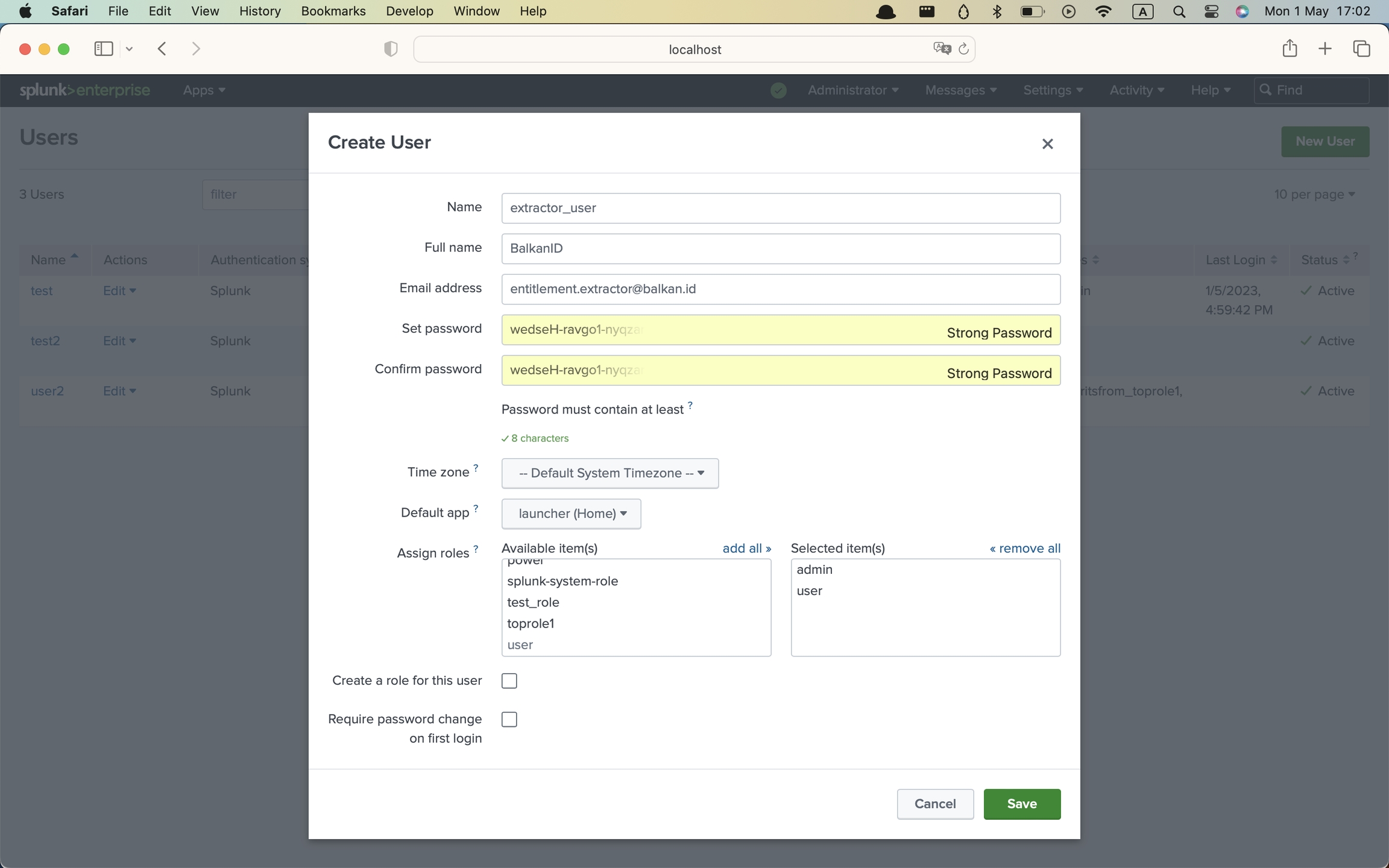 Open “Users” and create a new user for our extractor, assign them the admin role, and click Save.