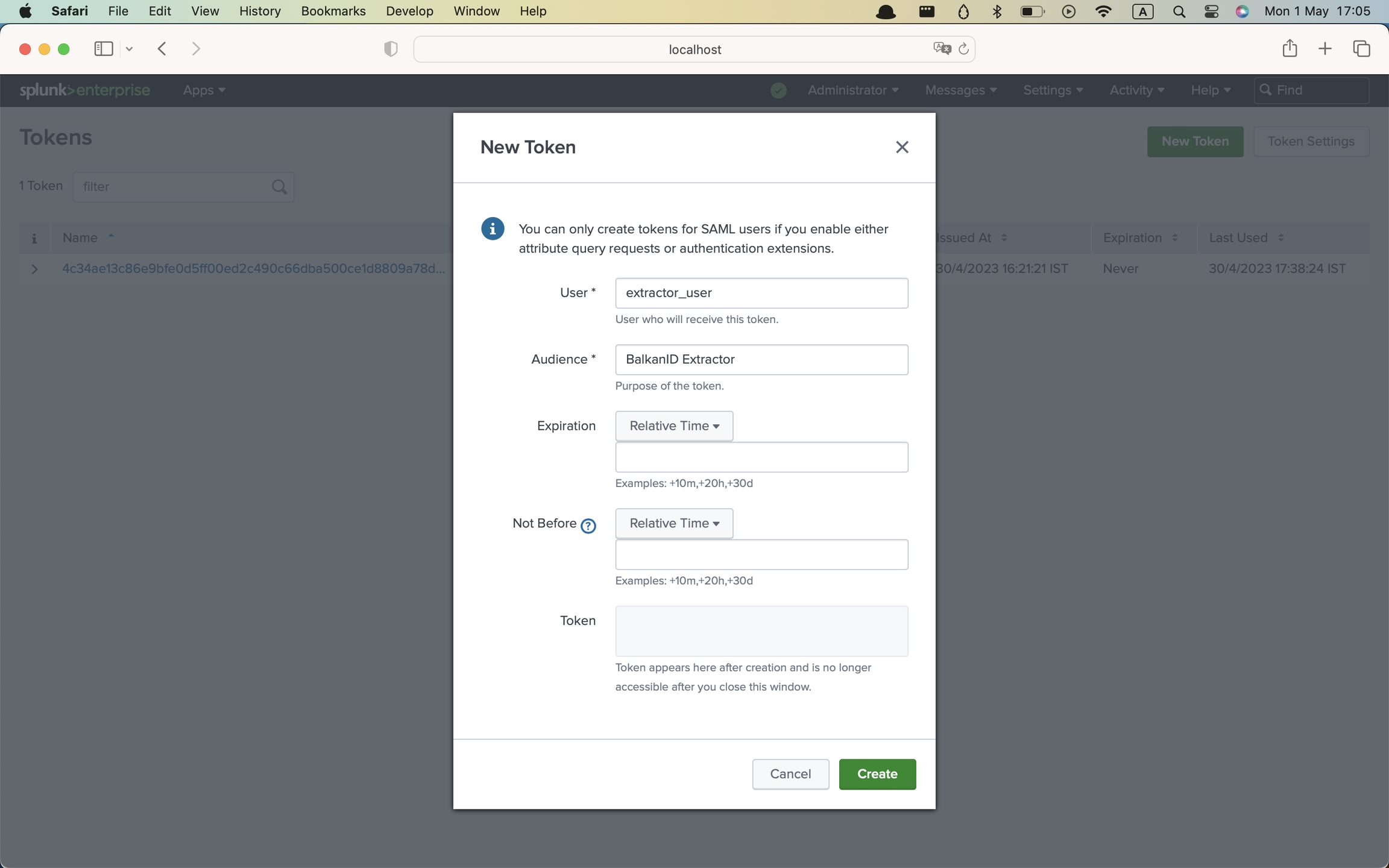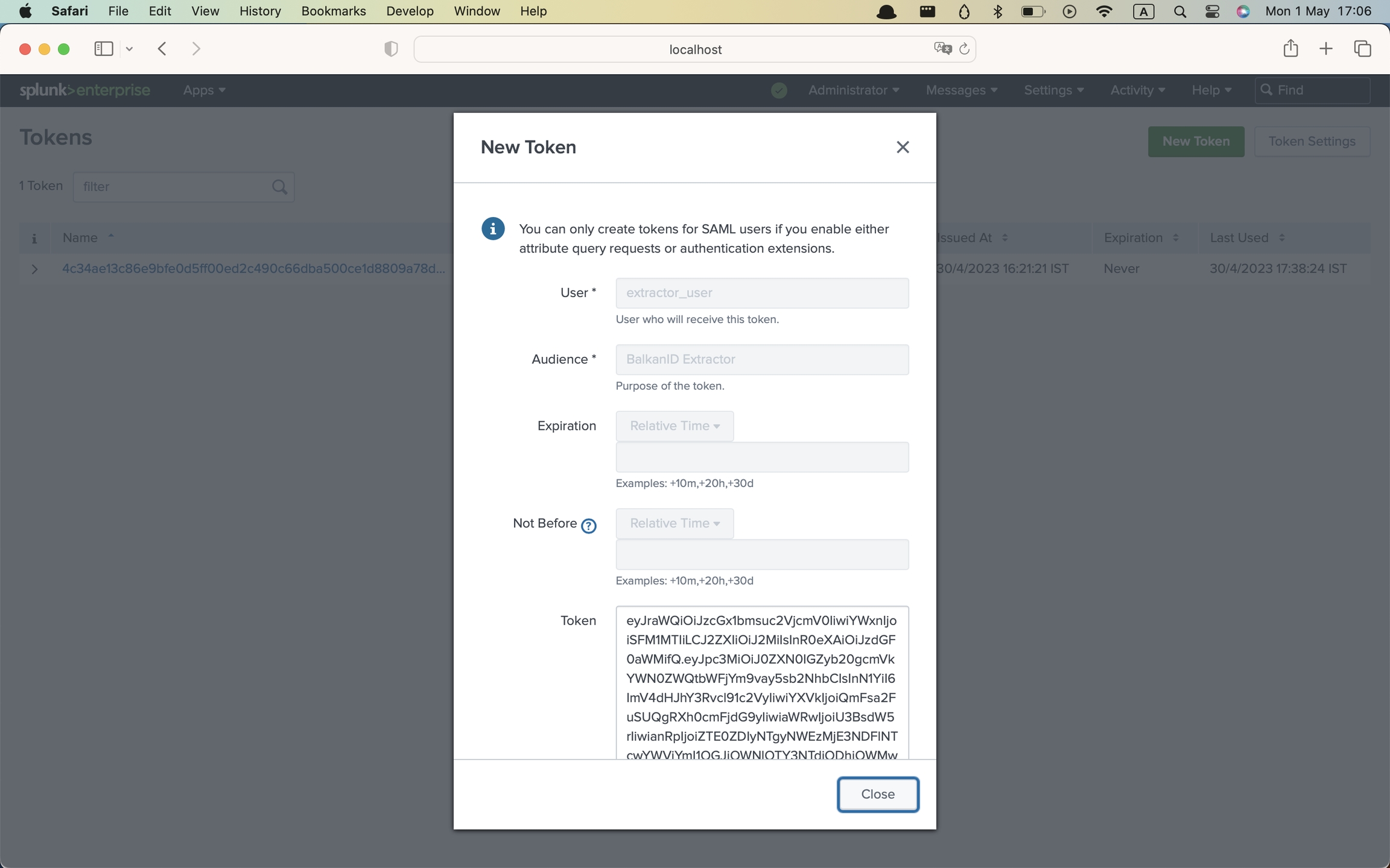 Now we will generate an access token for the user. Open Settings again, and click on Tokens and click on New Token. Enter the username of the extractor user, and the audience and expiry (leave it blank to use the default) and click on Create. The token will appear in the small box labelled as Token. Note the code down and keep it safe.