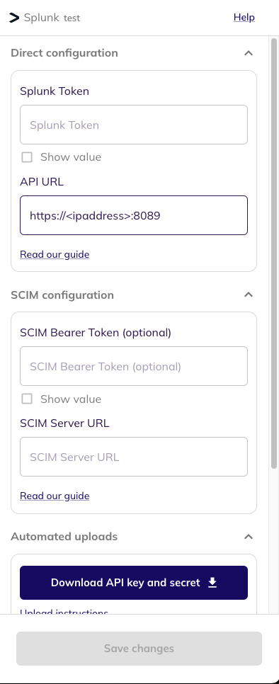 Splunk would have been added to the list of applications. Click on the Configure and Integrate button beside the integration name, and configure the fields with the values that were noted prior. It should look like this: