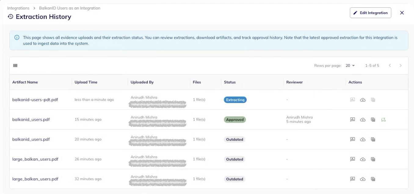 Use **Re-upload** on an approved extraction. This forces the sync pipeline to re-ingest that extraction. Useful in case of failed integration syncs post-approval.
