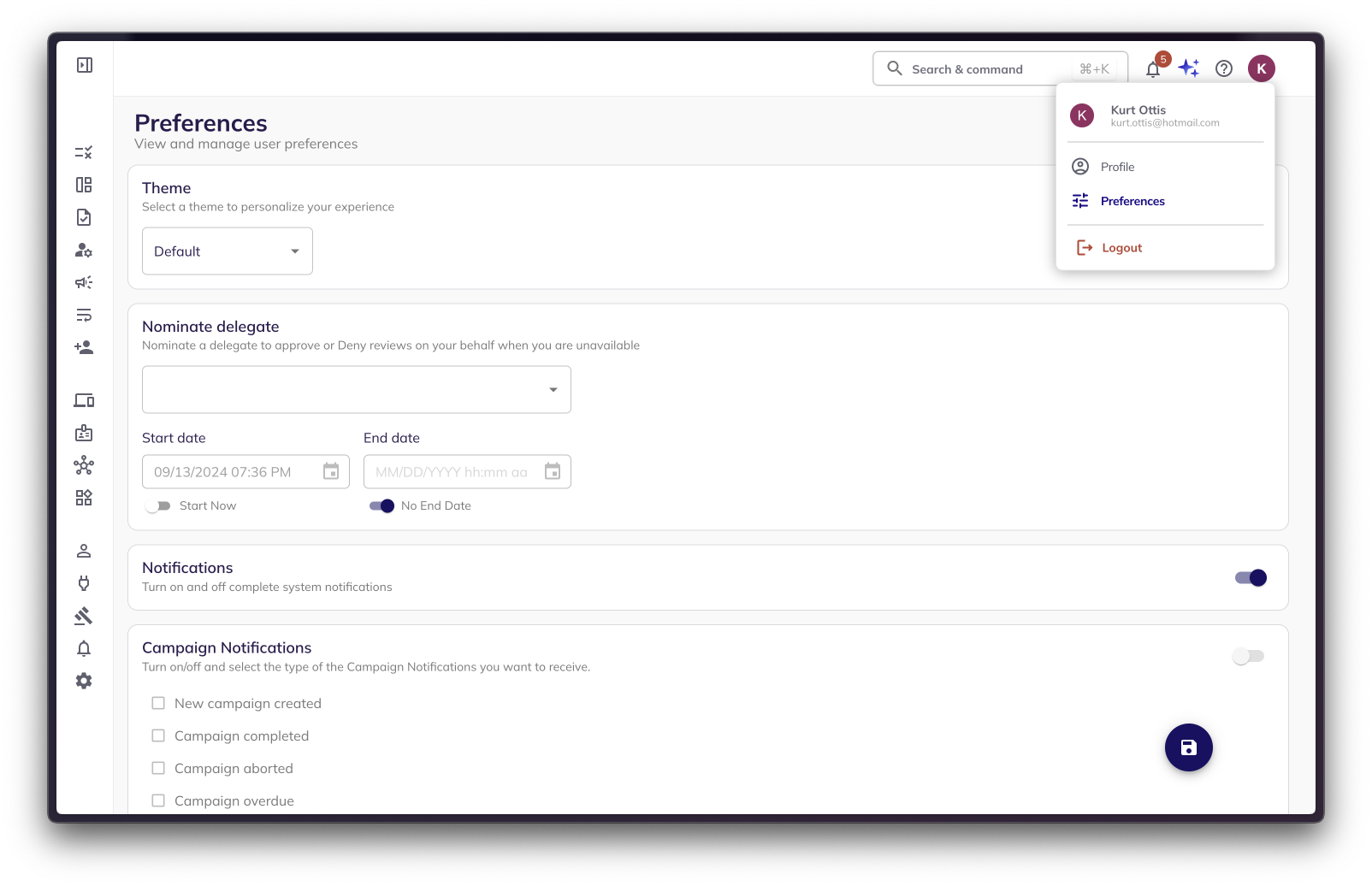 Individual users can opt out of notifications (if tenant admin has enabled them) entirely via **Account (Profile icon) → Preferences** by turning off the notification toggles—**but only if** the tenant admin has enabled the **"Allow user override"** option for all notifications.&#x20;