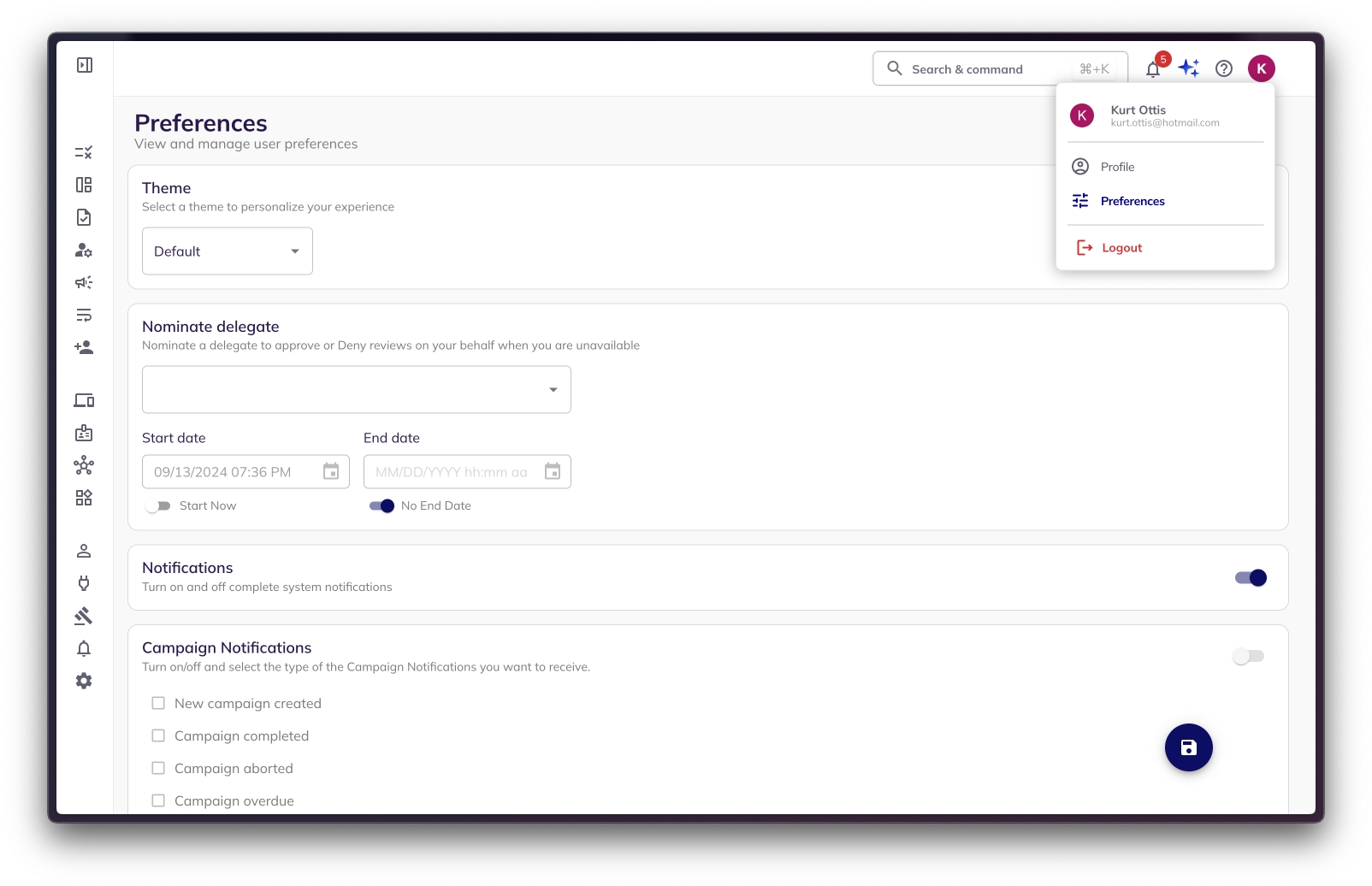 Individual users can opt out of notifications (if tenant admin has enabled them) entirely via Account (Profile icon) → Preferences by turning off the notification toggles—but only if the tenant admin has enabled the "Allow user override" option for all notifications.