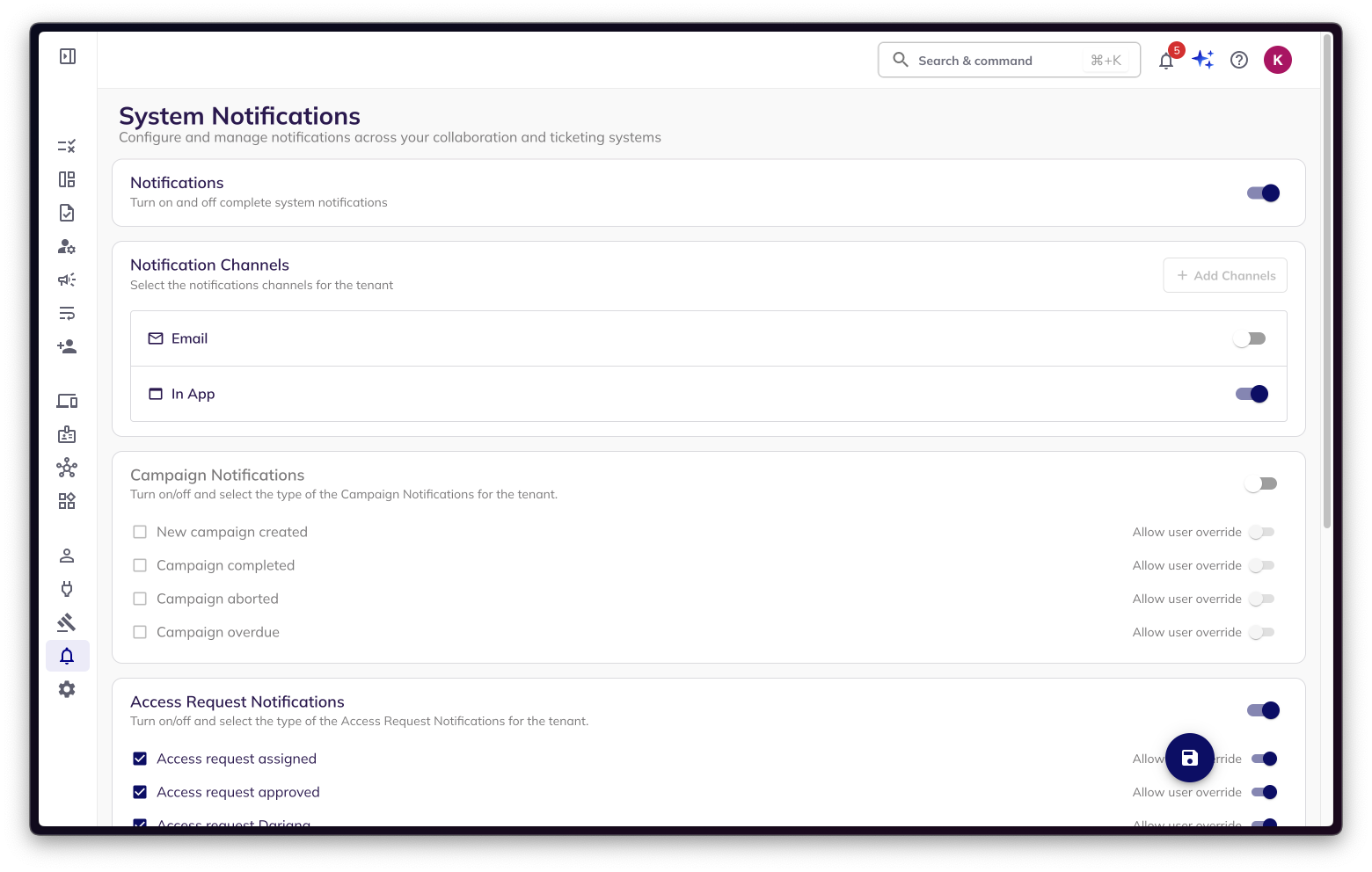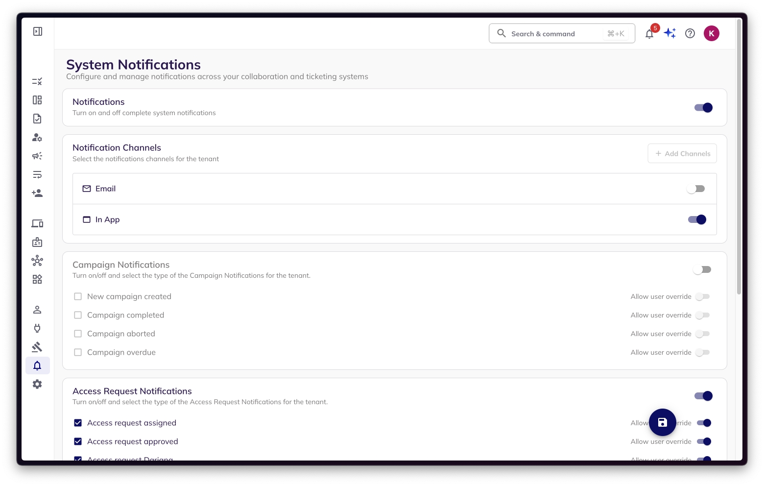 After selecting or changing the notification preferences, the admin has to click on the save button on the bottom right of the application to save the tenant-level preferences.