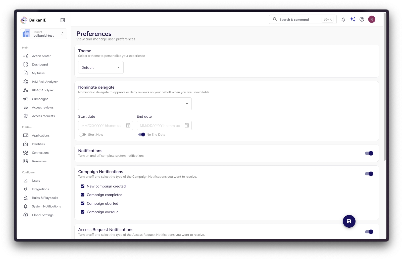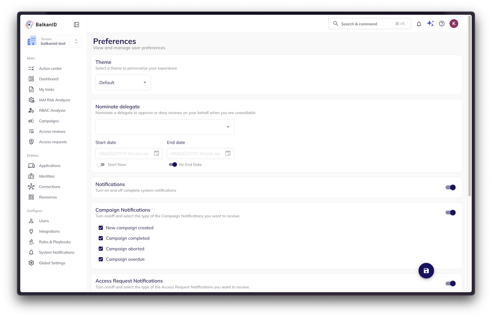 At BalkanID, we understand that efficient management of responsibilities is key to maintaining productivity. To help streamline your workflow, we offer the "Nominate Delegate" feature within the Account Preferences tab. When you are unavailable, this feature allows you to delegate the management of reviews created via campaigns or access requests to a designated person of your choice. Here’s how it works and how you can set it up.