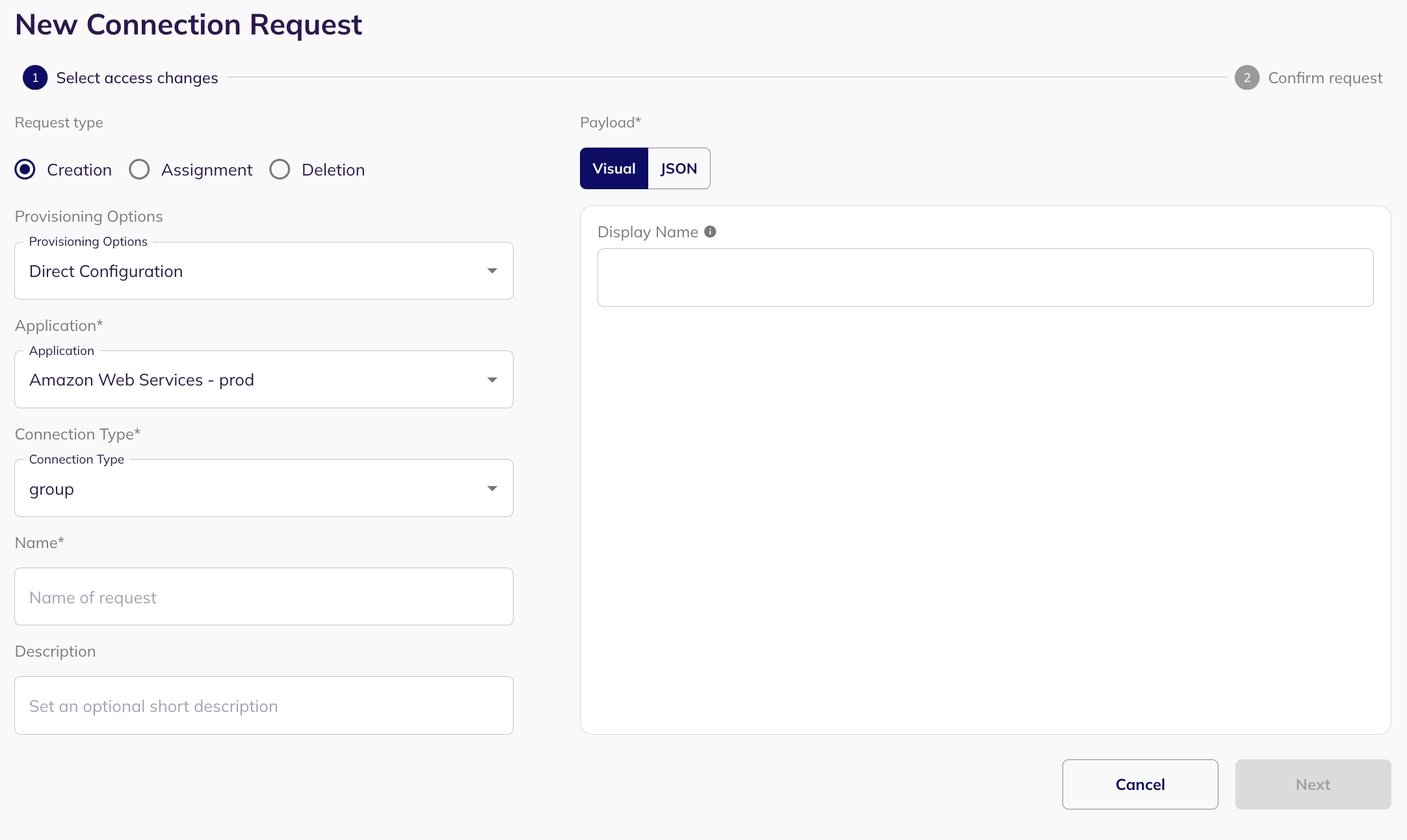 Fill the Payload: Upon selecting an application, a visual (payload) form will appear on the page. Complete this form with the necessary information to create the new connection.