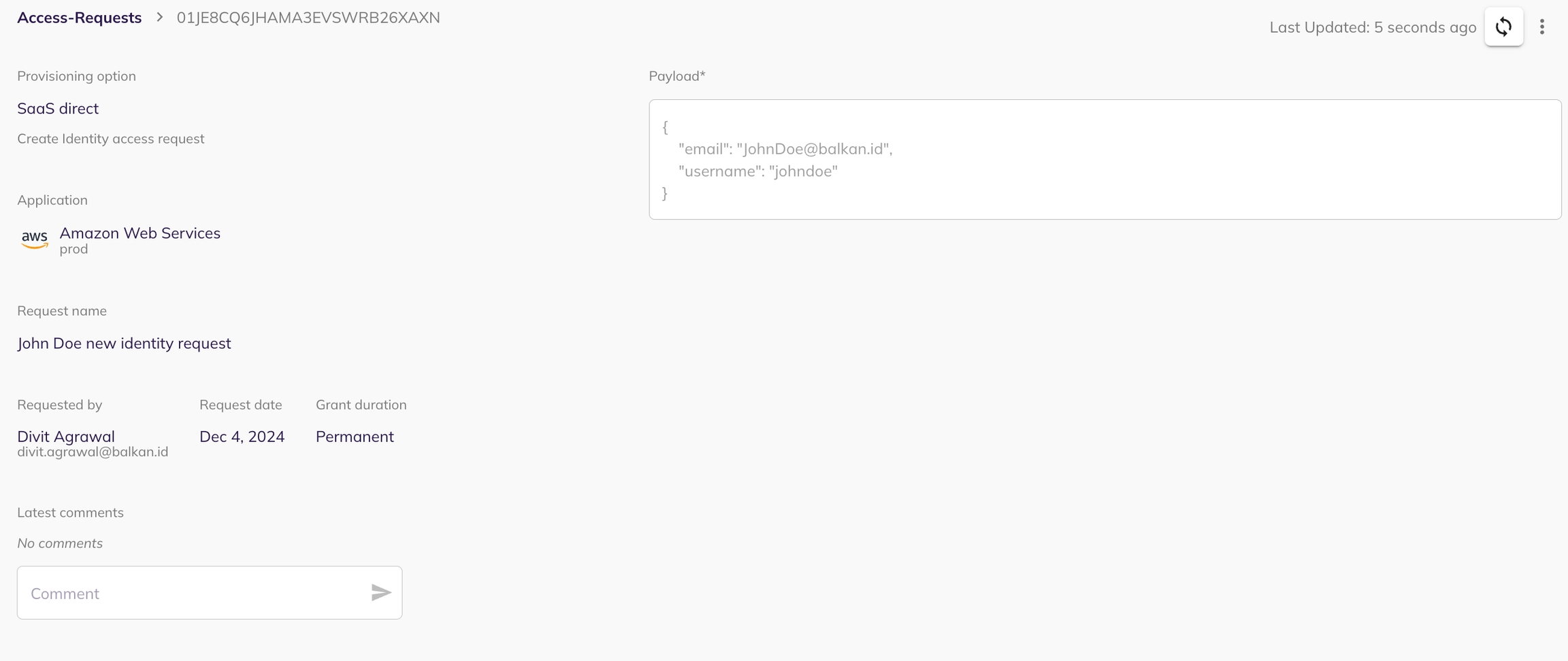 Fill the Payload: Upon selecting an application, a form (payload) will appear on the page. Complete this form with the necessary information to create the new identity.