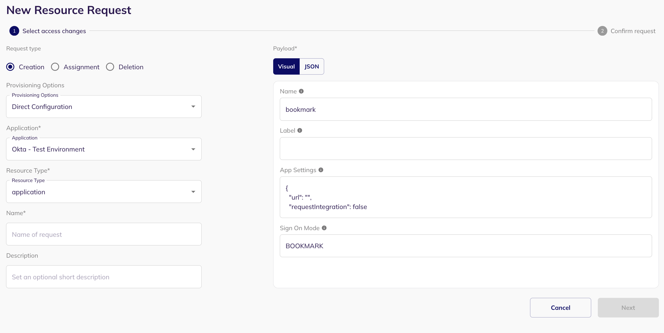 Select Creation: Choose the "Creation" radio button to initiate the resource creation process. Choose a Provisioning Option: Select a provisioning option. Choose an Application: Select the application where you want to create a new resource. Choose a Resource Type: Select a resource type from the existing resource types. Select a name: Select a name for the new access request.