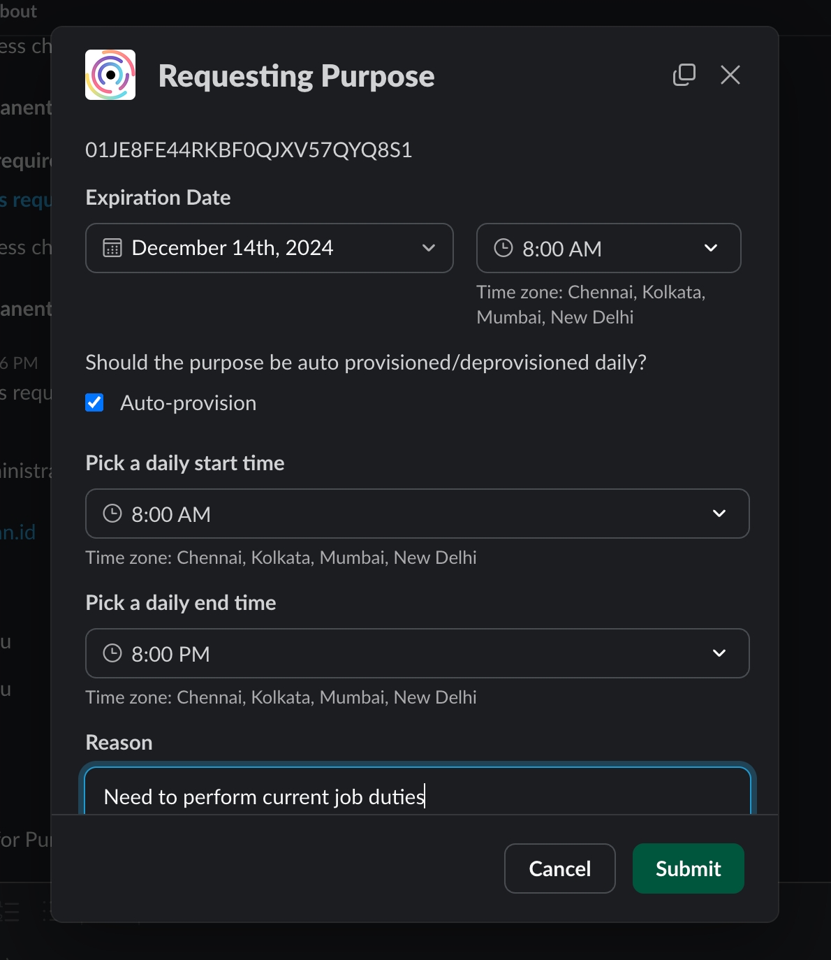 After creation, the new user-purpose access request will be visible on the Access Requests page. The appropriate reviewer assigned to the request will receive a notification (via email, Slack, or in-app) prompting them to review the request.
