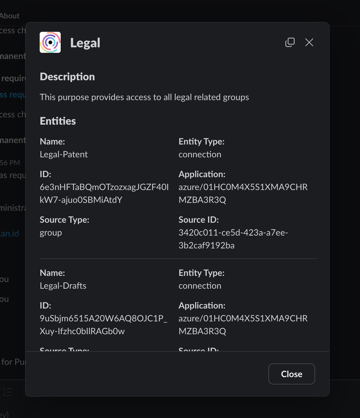 To view the connections/resources the purpose provides access to, click on the three-dot menu and click on "Details". This opens up the purpose details dialog.
