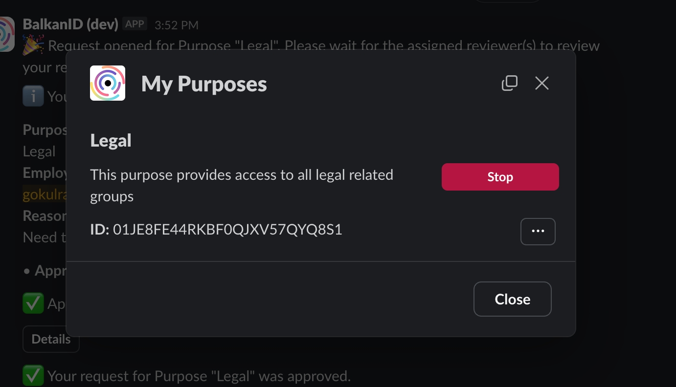 /my-purposescommand. This will display a list of all purposes assigned to the user.