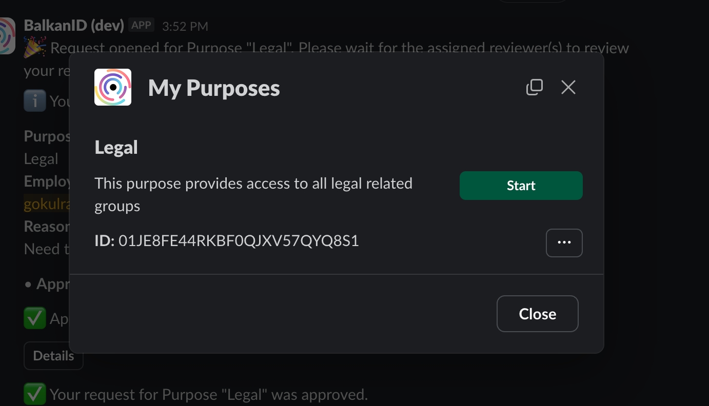 To start a purpose assigned to a user, the user must utilize the Slackbot to initiate their assigned purpose. Follow these steps: