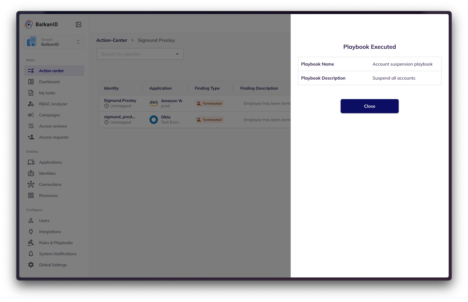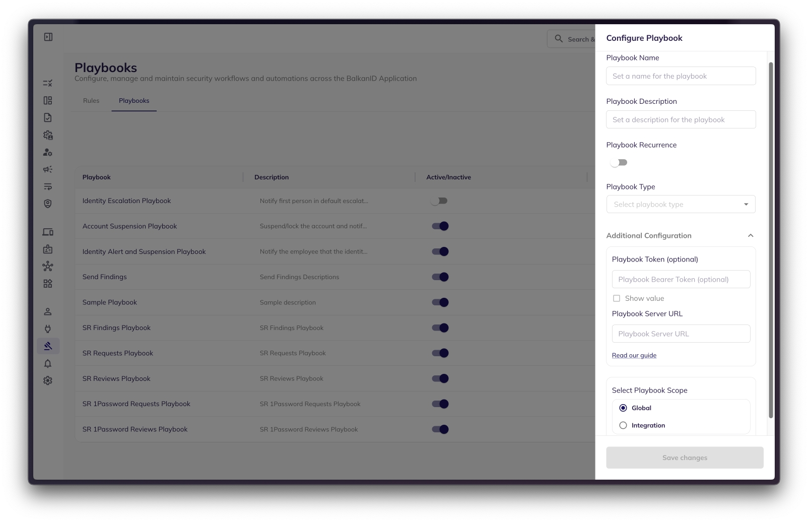 BalkanID offers a robust and seamless way to set-up, configure and send data to external playbook servers. There are two kinds of playbooks that can be enabled namely: global playbooks and integration specific playbooks. In this article, we will review configuring global playbooks. Configuring global playbooks is a fairly straightforward and easy process, designed to enhance system functionality and versatility on per application integration basis, while all data encrypted in transit. By following a simple setup process, you can effortlessly set up, edit, and utilize global-specific playbook, ensuring smooth execution and efficient handling of auto-remediation of your playbook interactions on access reviews, access requests or findings in action center.