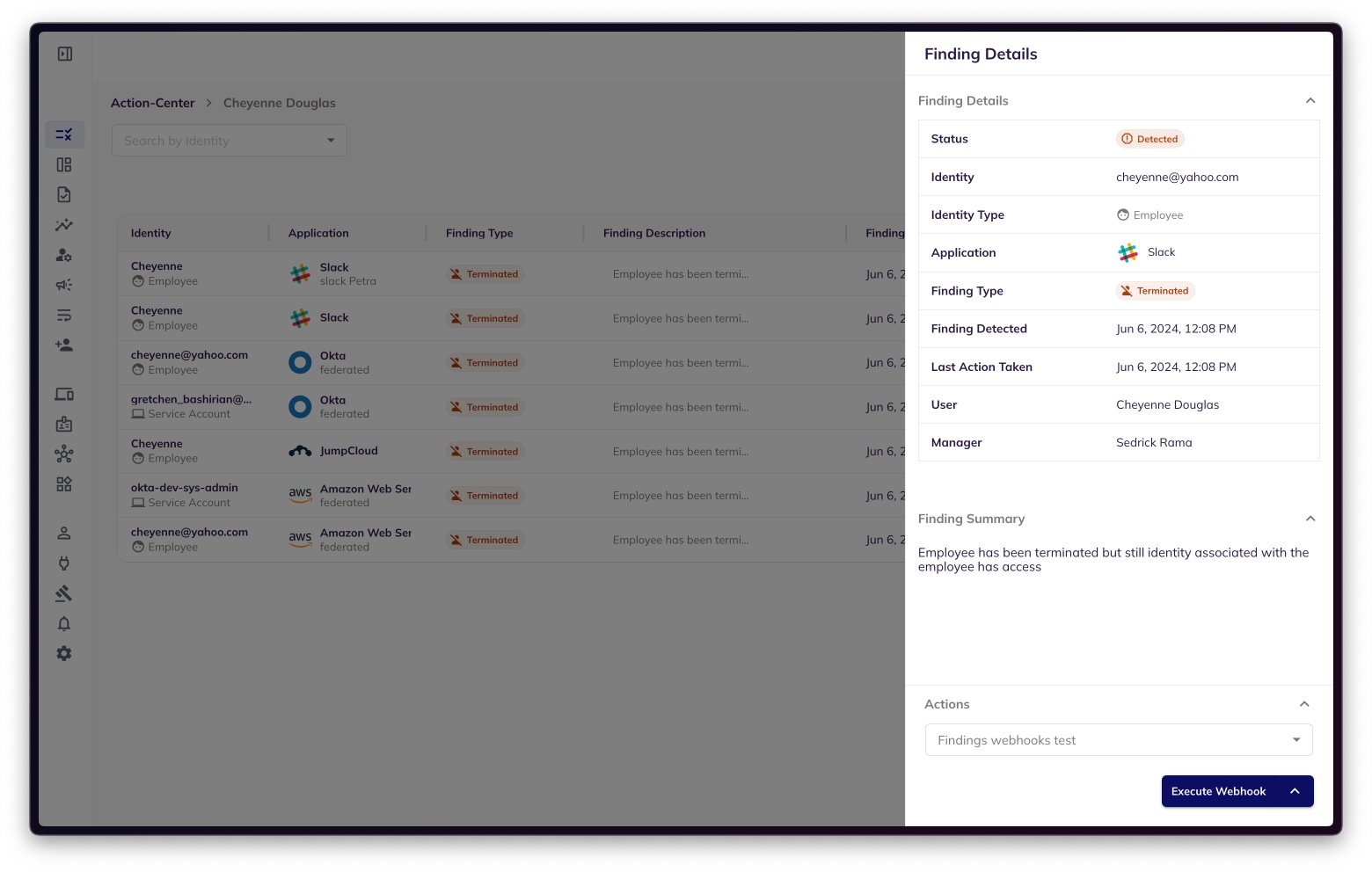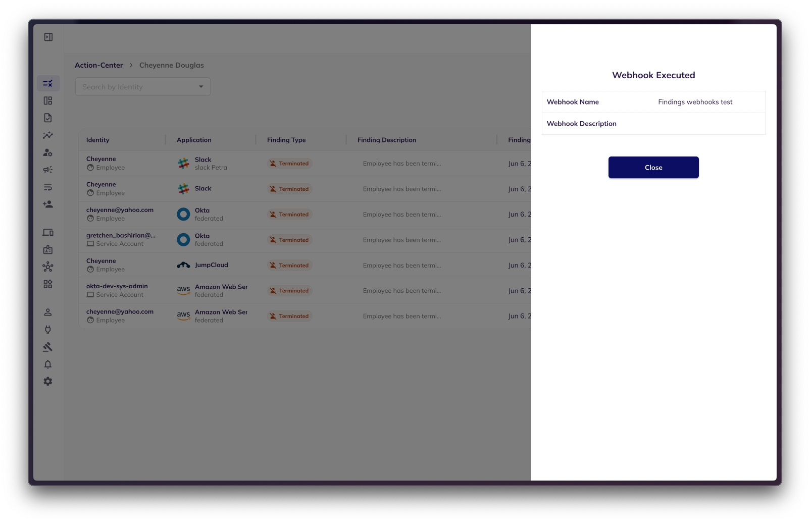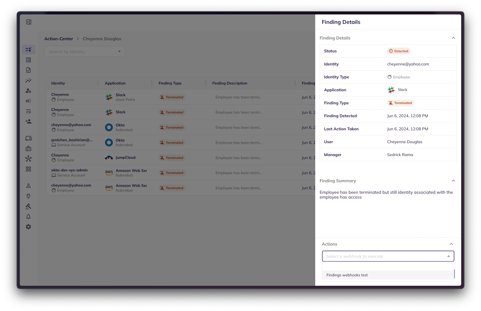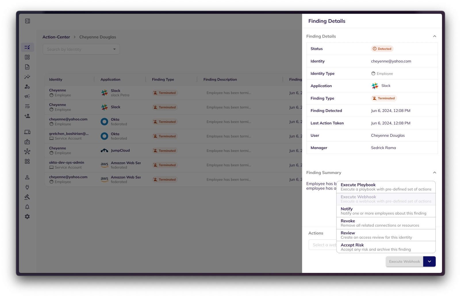 You can execute a pre-configured webhook against any item in BalkanID. For instance, to execute a webhook against a finding, just select the webhook to run and execute it.