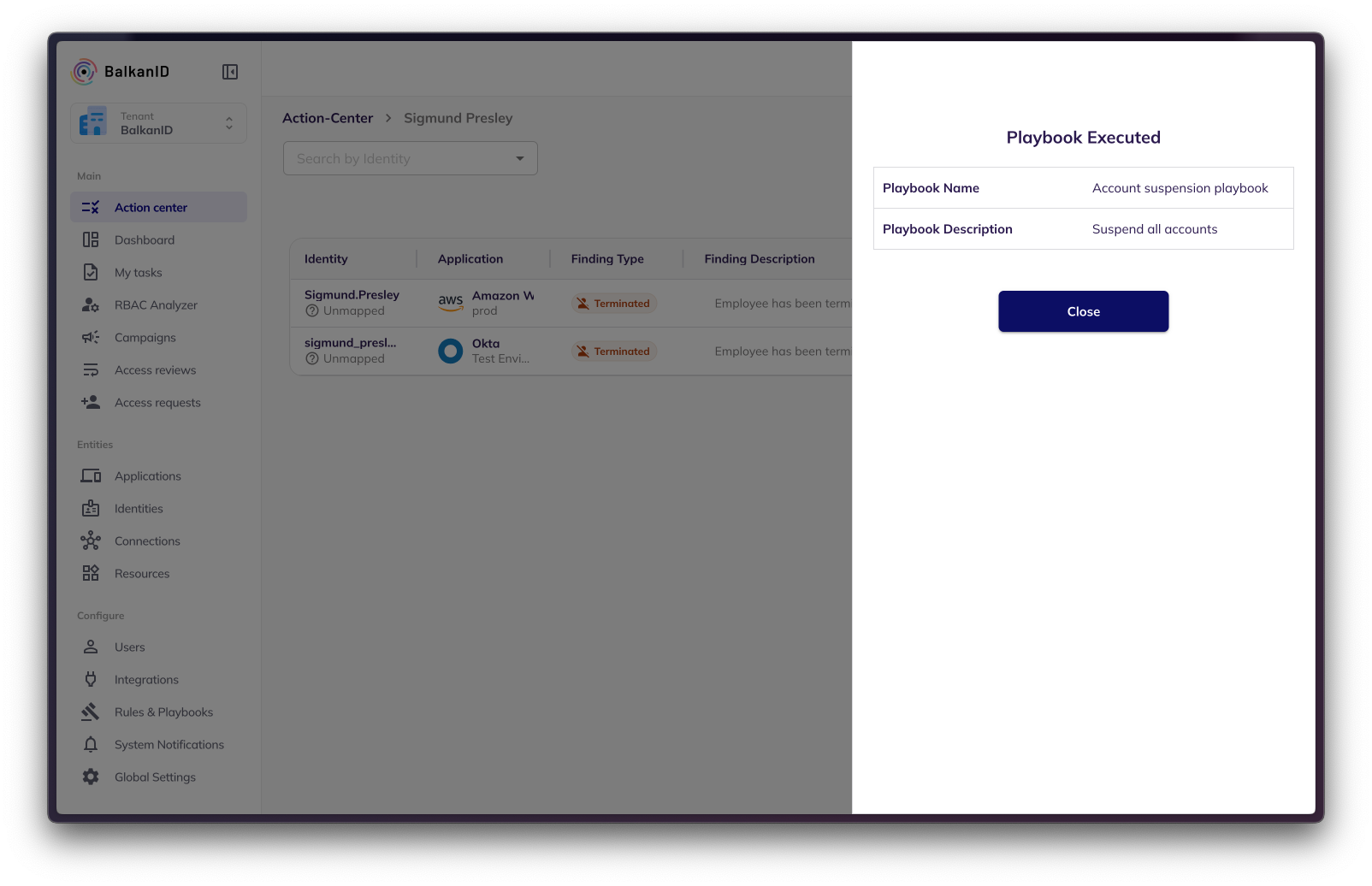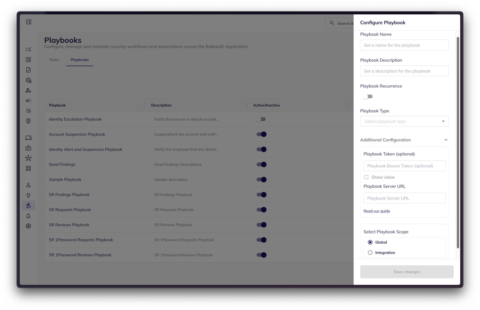 BalkanID offers a robust and seamless way to set-up, configure and send data to external playbook servers. There are two kinds of playbooks that can be enabled namely: global playbooks and integration specific playbooks. In this article, we will review configuring global playbooks. Configuring global playbooks is a fairly straightforward and easy process, designed to enhance system functionality and versatility on per application integration basis, while all data encrypted in transit. By following a simple setup process, you can effortlessly set up, edit, and utilize global-specific playbook, ensuring smooth execution and efficient handling of auto-remediation of your playbook interactions on access reviews, access requests or findings in action center.