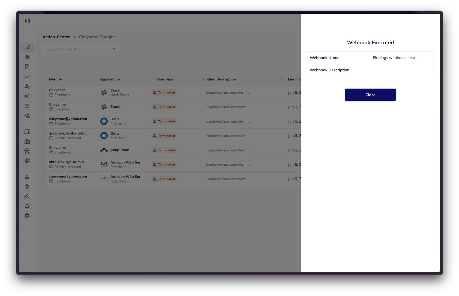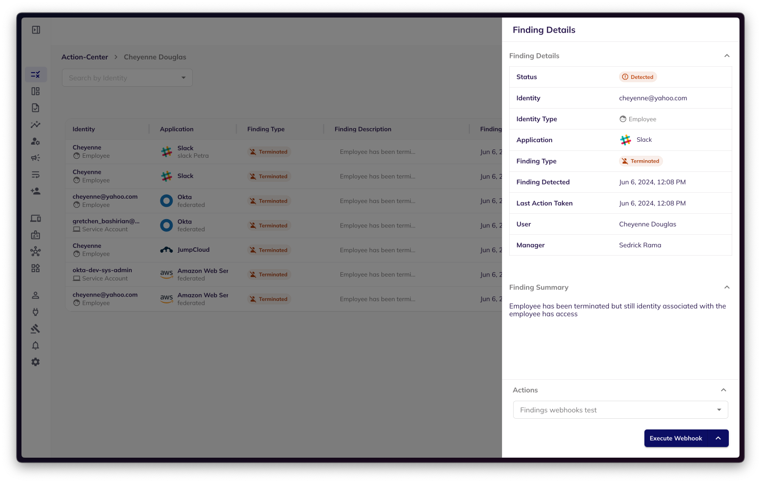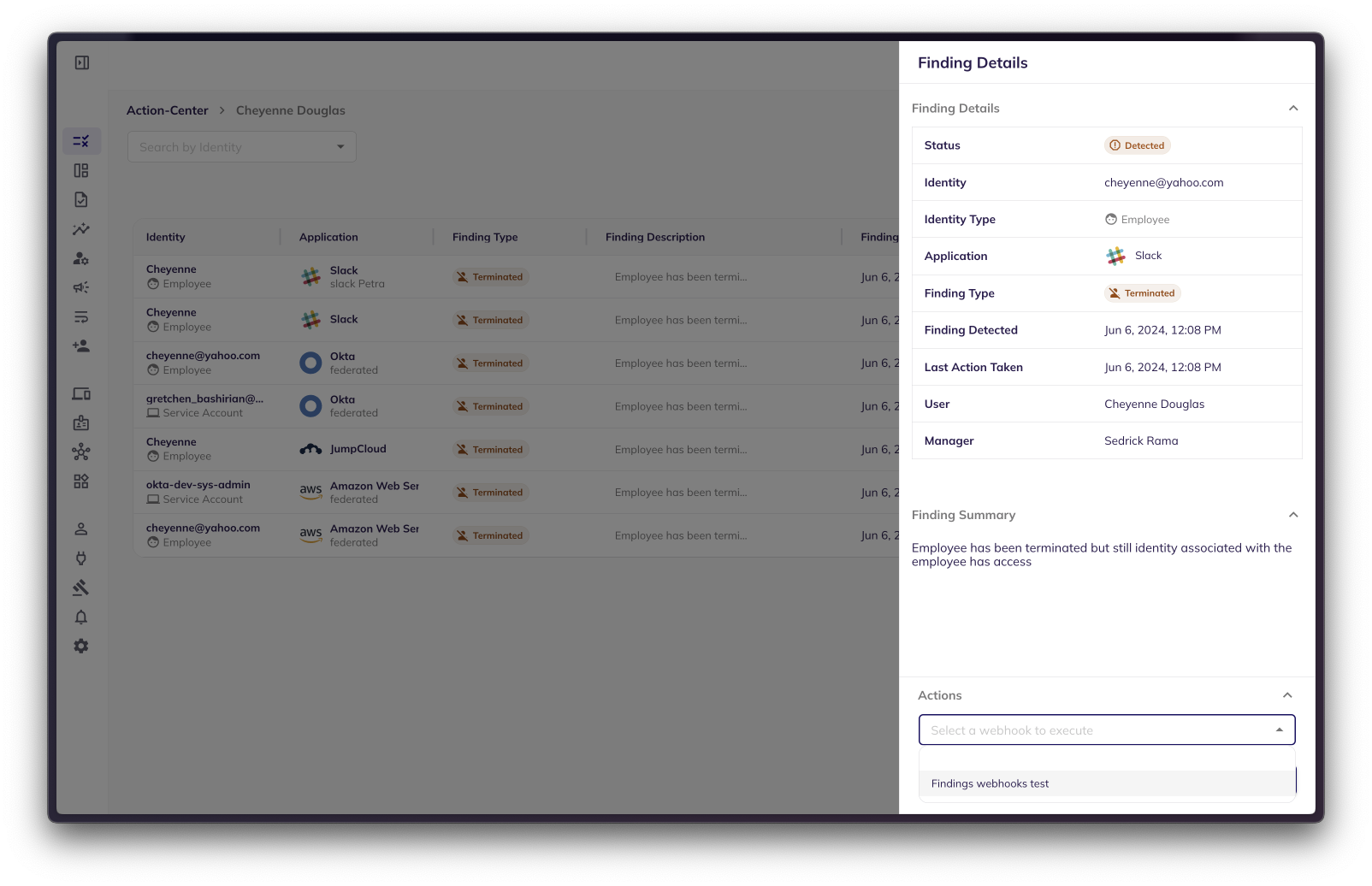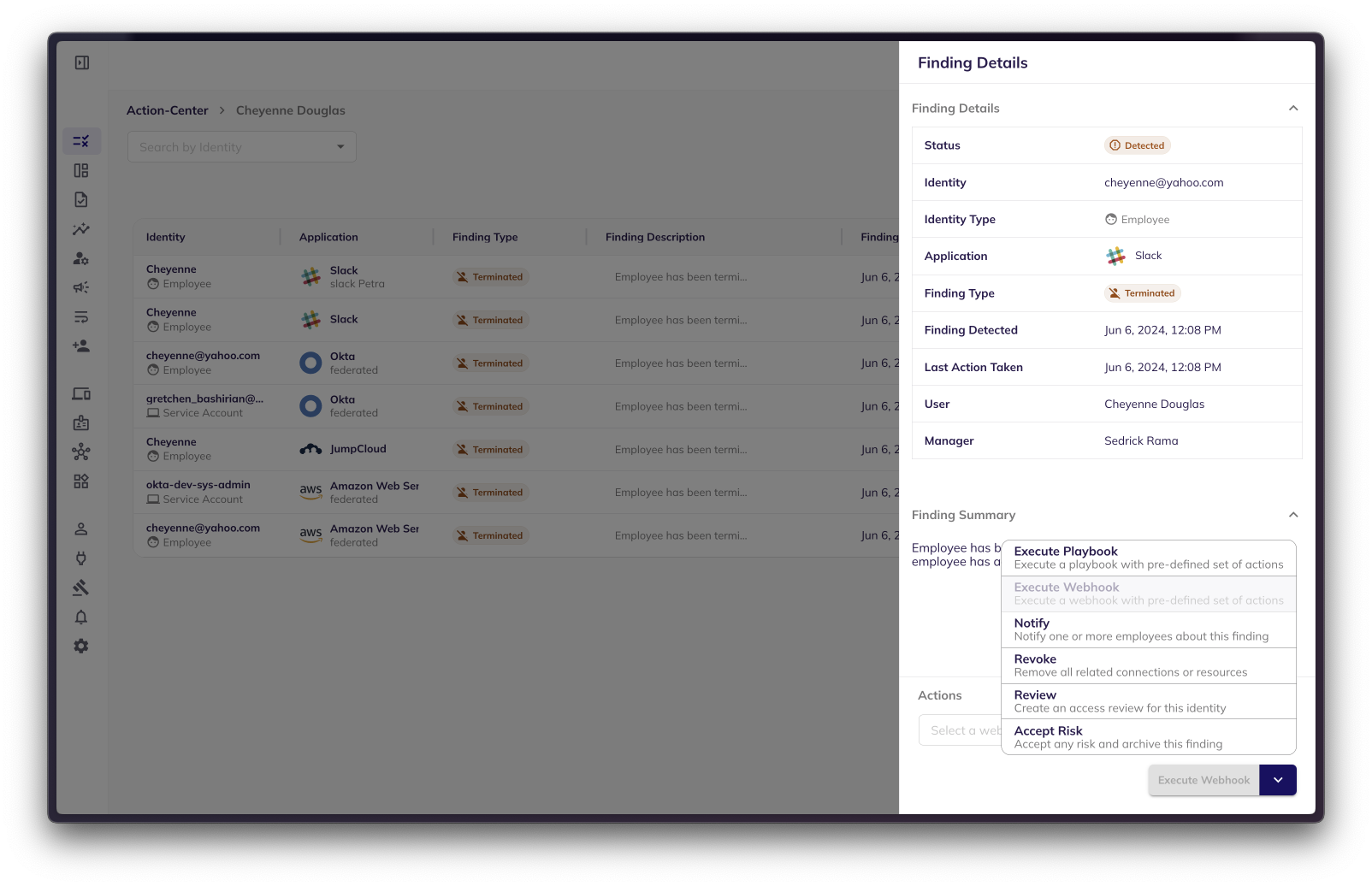 You can execute a pre-configured webhook against any item in BalkanID. For instance, to execute a webhook against a finding, just select the webhook to run and execute it.