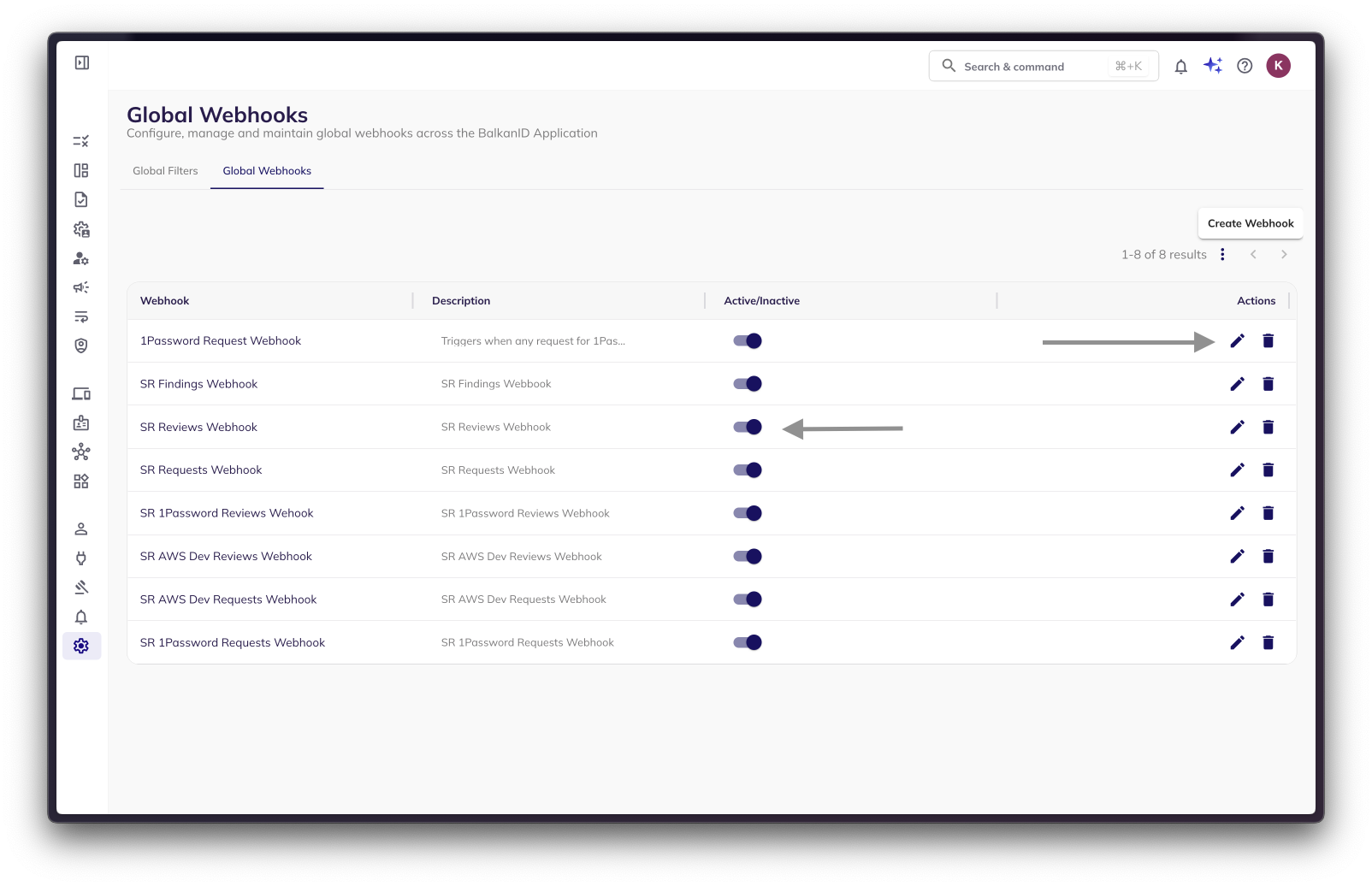 Editing the global webhook is as simple as selecting the edit icon against the webhook to edit in the Global settings > Global webhooks page.