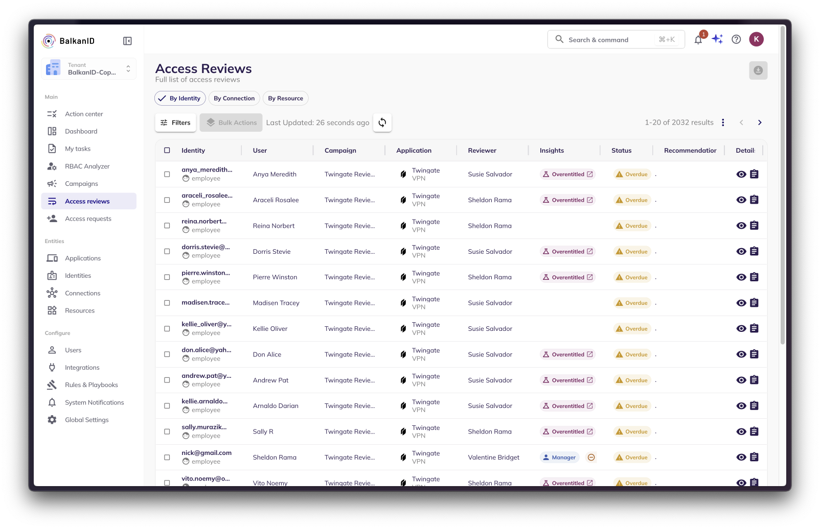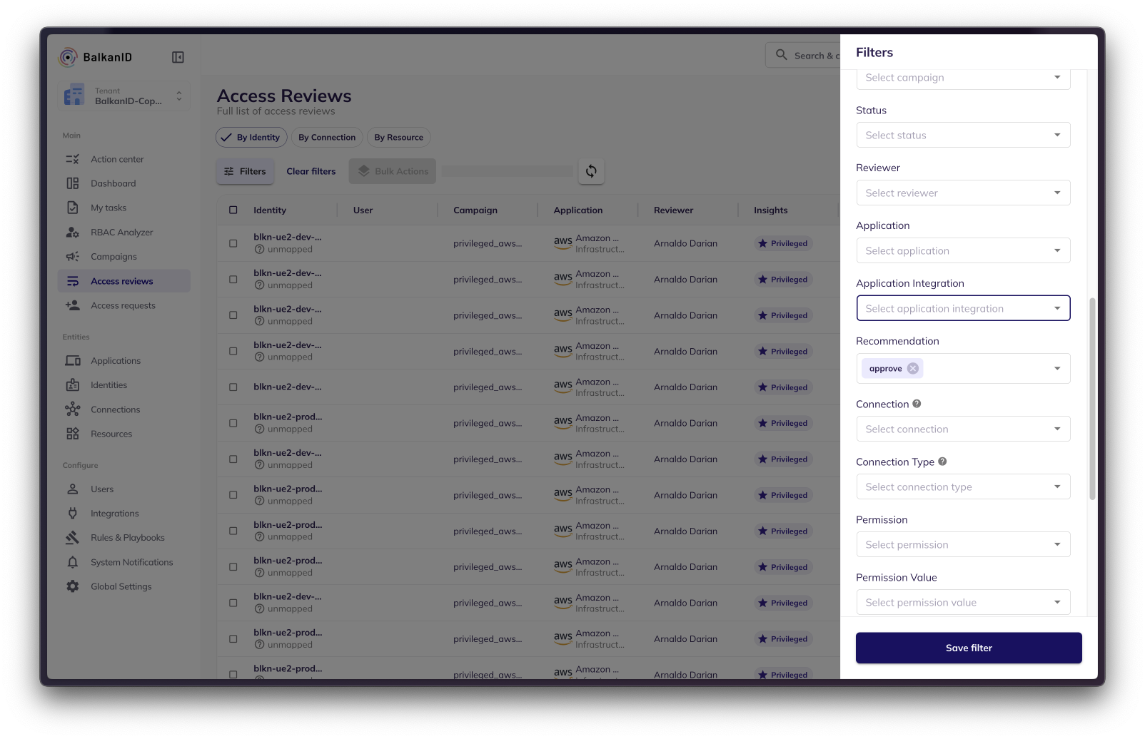 As part of the access review process, BalkanID provides recommendations to enable reviewers to make decisions that reduce risk while minimizing friction. There is a column called "Recommendations" with an approve or deny recommendation that is also filterable to ensure reviewers can prioritize reviews accordingly. BalkanID AI recommends these actions based on looking at the entire dataset of entitlements and the various parameters (connections, insights) as well as the prior behavior of the reviewer.