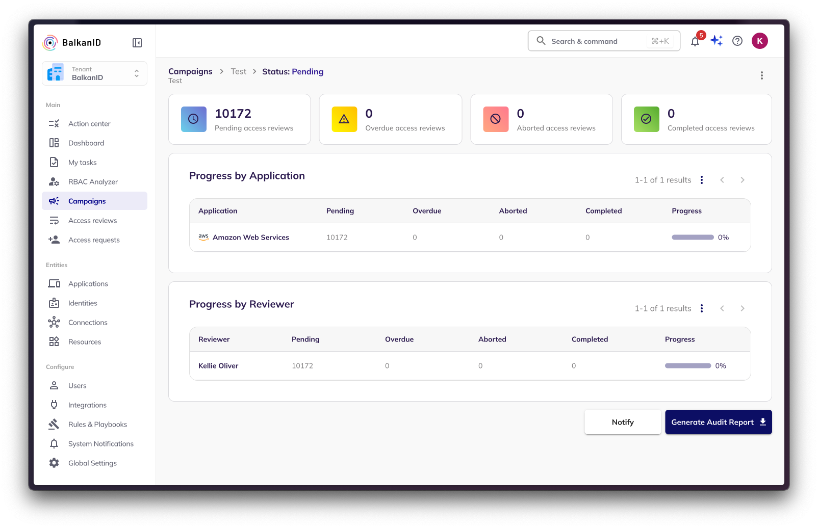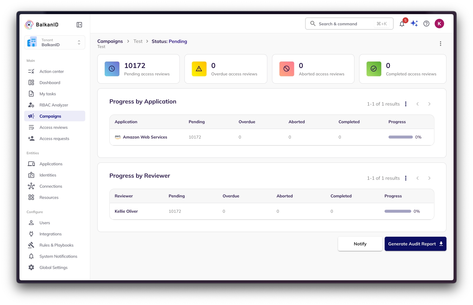 Risk Managers can download PDF reports for any active or completed campaigns that will reflect the state of the campaign. Generally, risk managers download such reports for completed campaigns to store audit proof of access reviews being completed. The reports will contain the campaign name, start & end dates, and review status of each identity, application & entitlement included in the access review campaign.